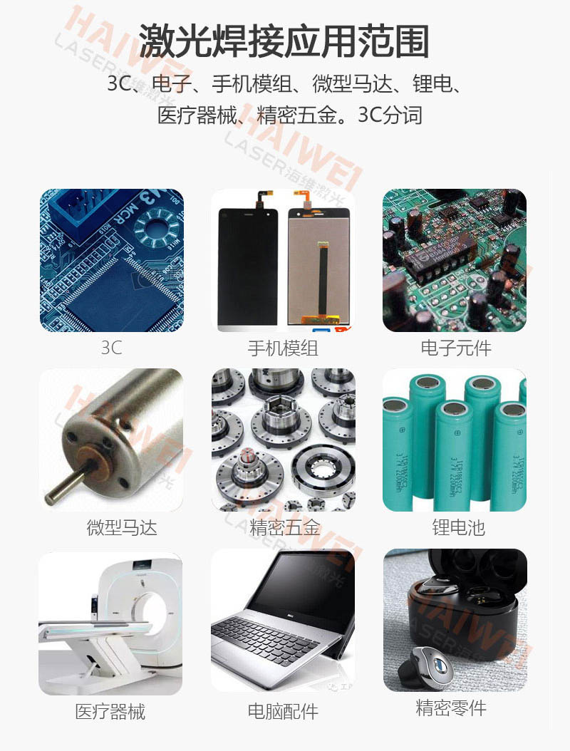 应用领域:3C、电子、手机模组、微型马达、锂电、医疗器械等精密焊接