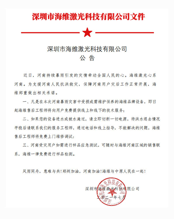 风雨面前,我们一起抗! 海维激光关于河南涉灾客户的郑重承诺